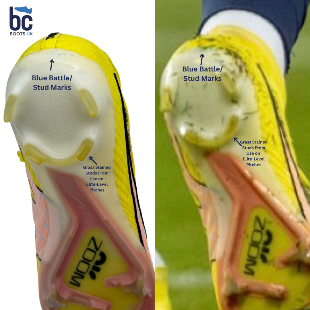 - Signs of elite match use throughout: scuffs, sole wear, and surface abrasions.