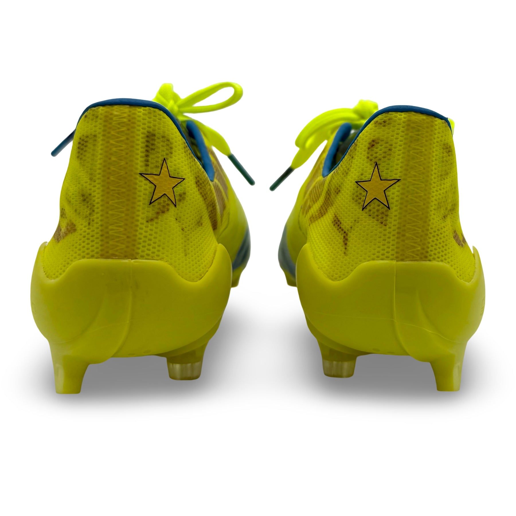 • Ambas botas también cuentan con una estrella amarilla en el lado medial del área del talón, para representar la victoria de Francia en la Copa del Mundo (desde que ganó la Copa del Mundo en 2018, Griezmann ha tenido 2 de estas estrellas en sus botas).