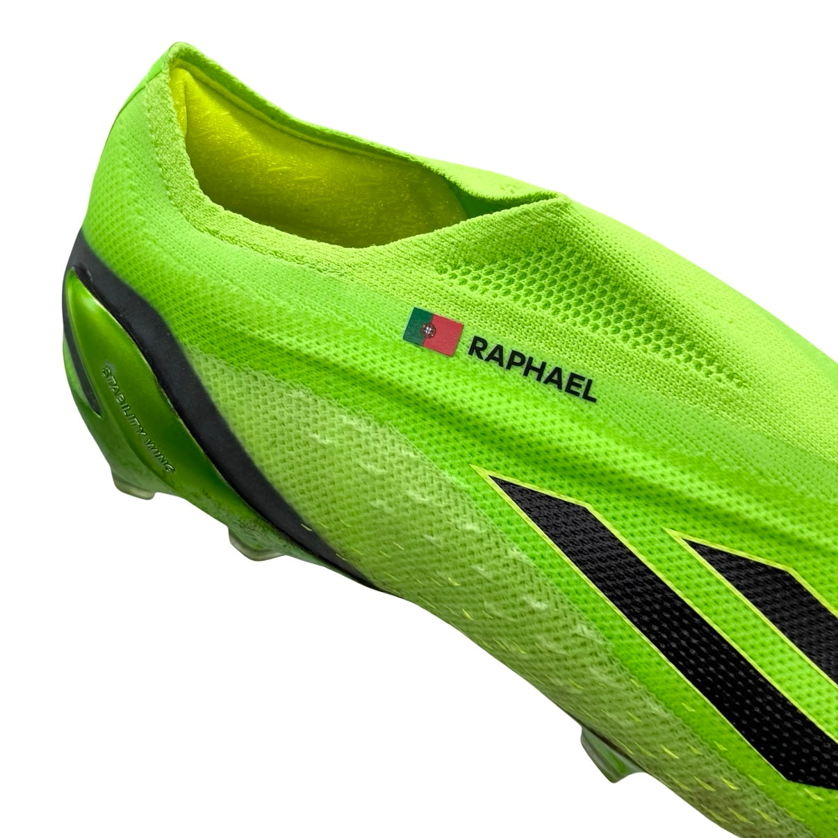 • Cada bota presenta la personalización del nombre del jugador 'RAPHAEL' y la bandera de Portugal en el lateral de la parte superior.