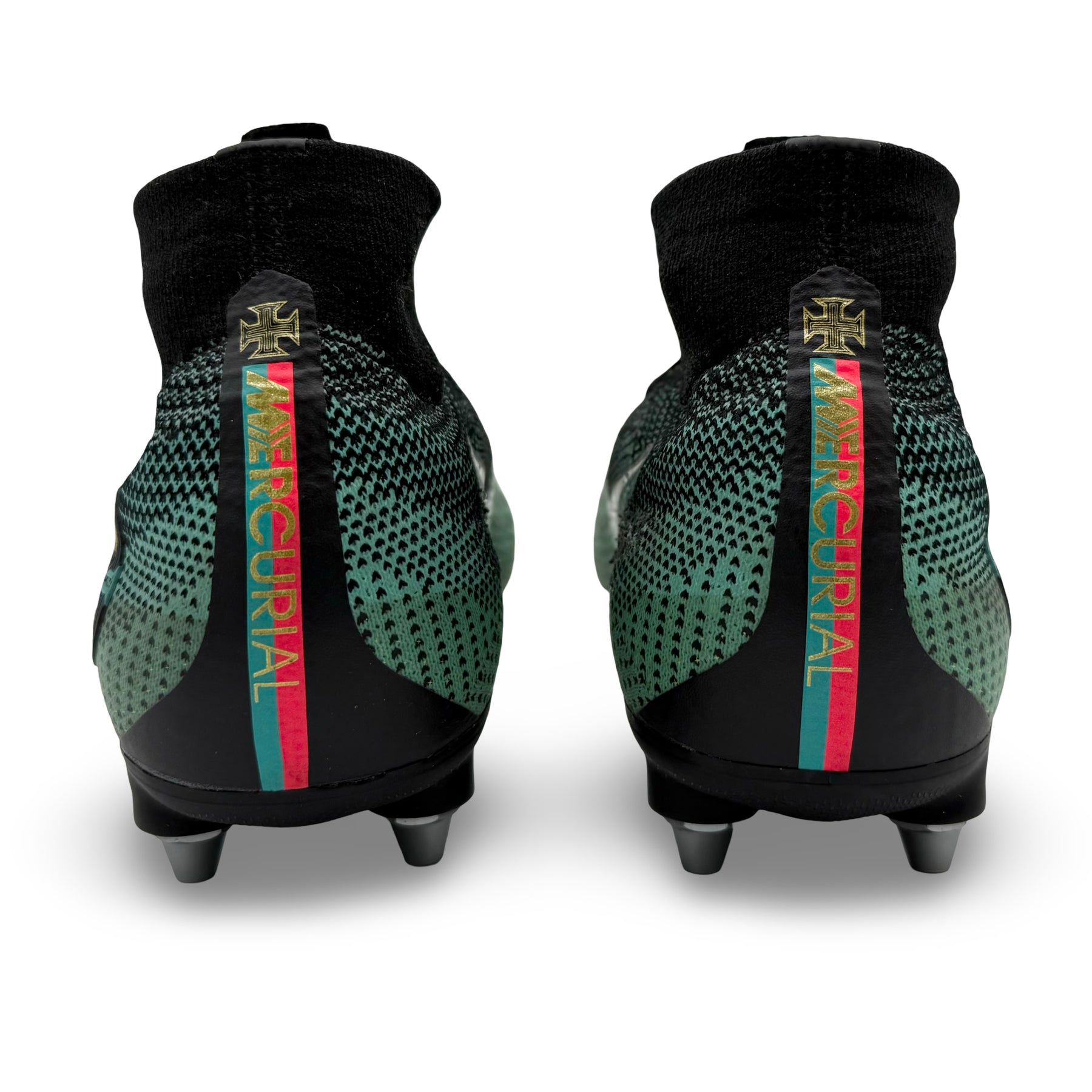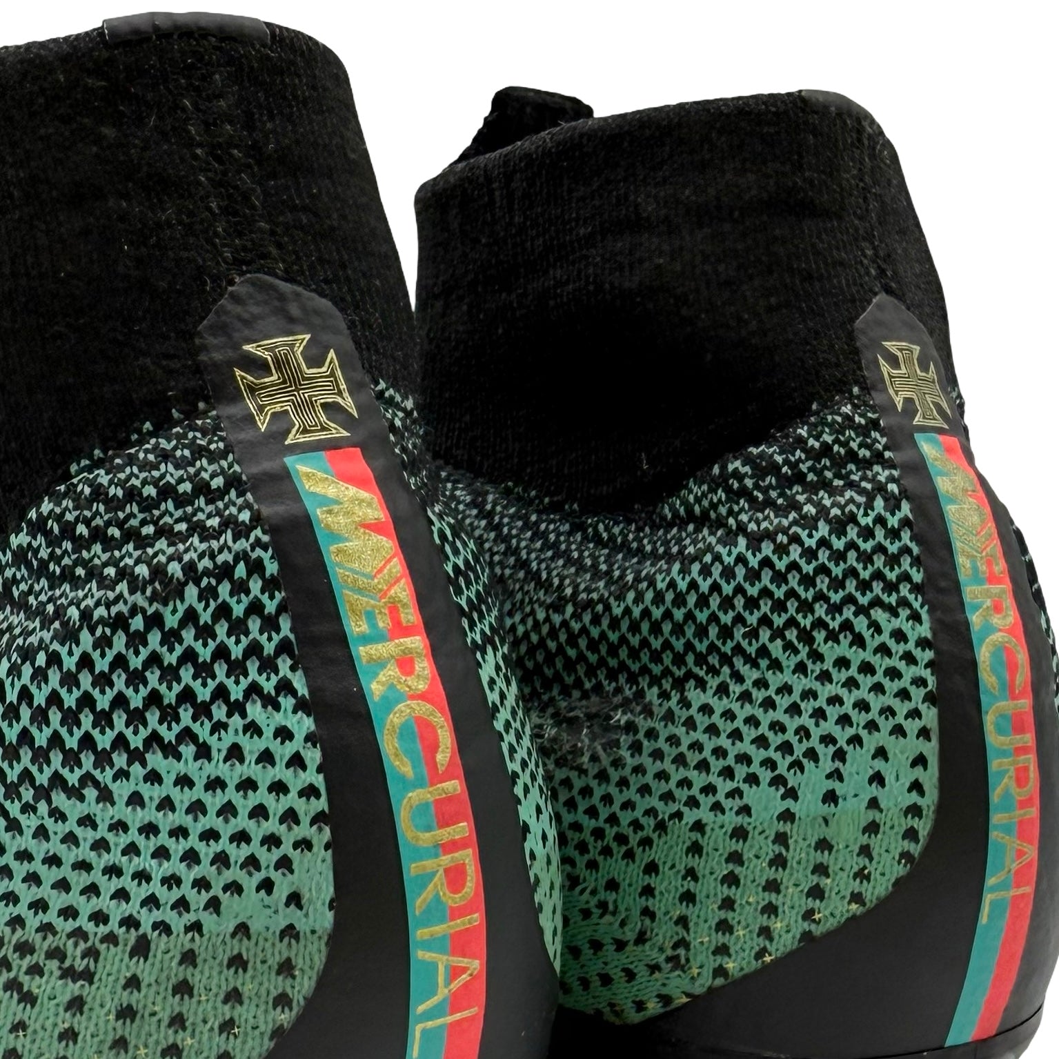 • The heels display Portugal’s national colours — red and green — with gold Mercurial branding and the Portugal emblem above, celebrating his leadership as national team captain.