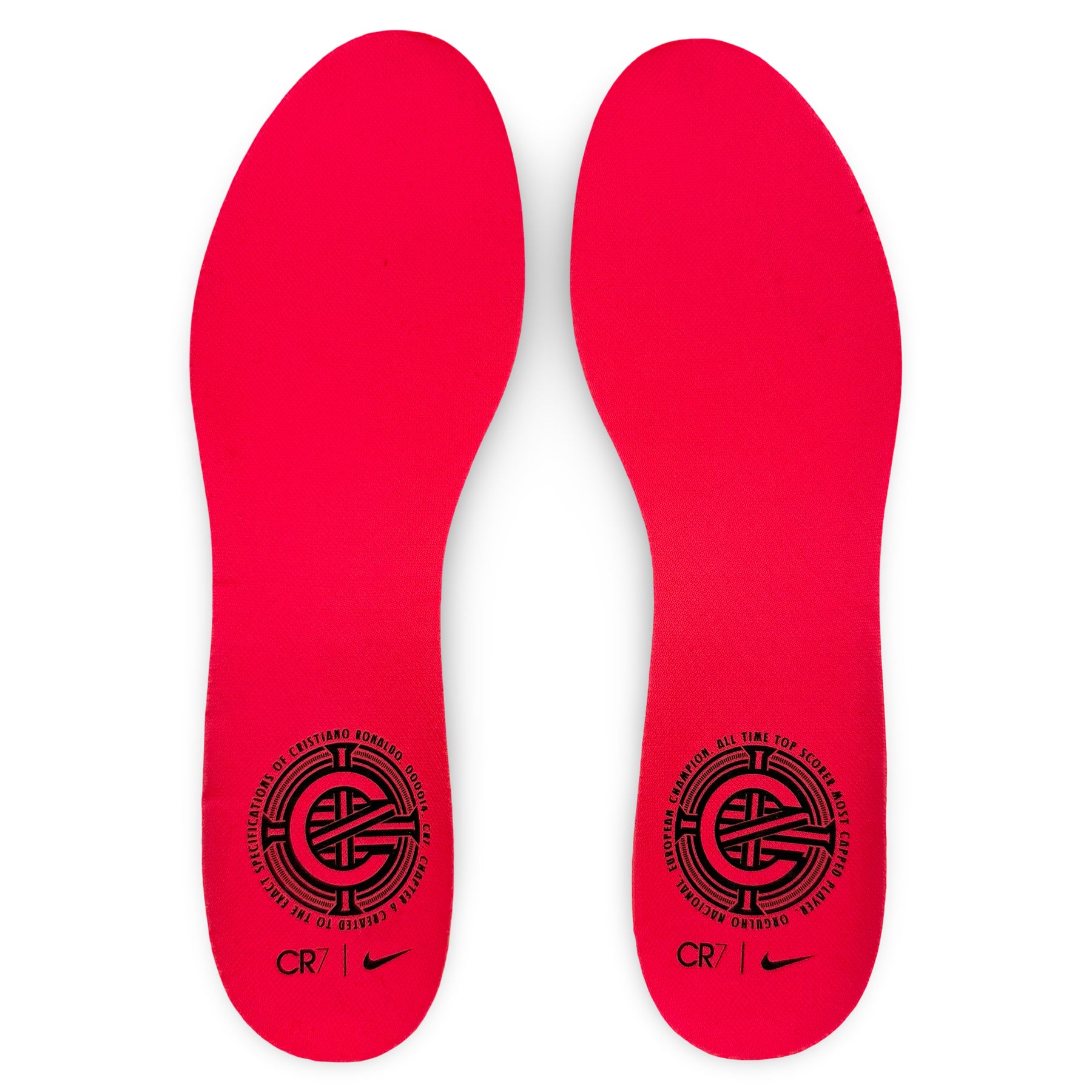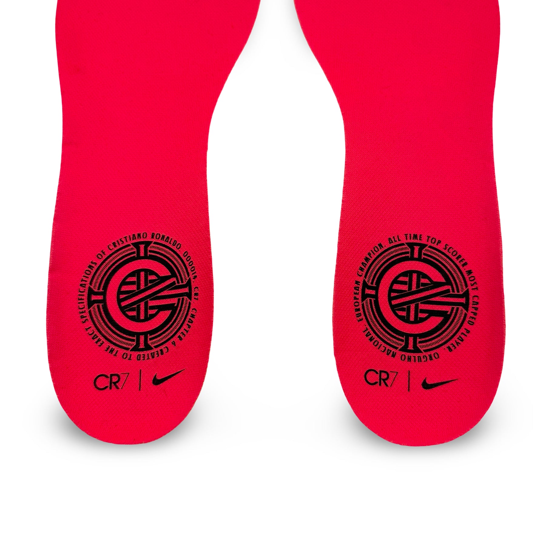 • Custom insoles feature the CR7 logo, Nike Swoosh, and “Born Leader” crest — surrounded by inscriptions reading: “European Champion • All Time Top Scorer • Most Capped Player • Orgulho Nacional” (“National Pride”).