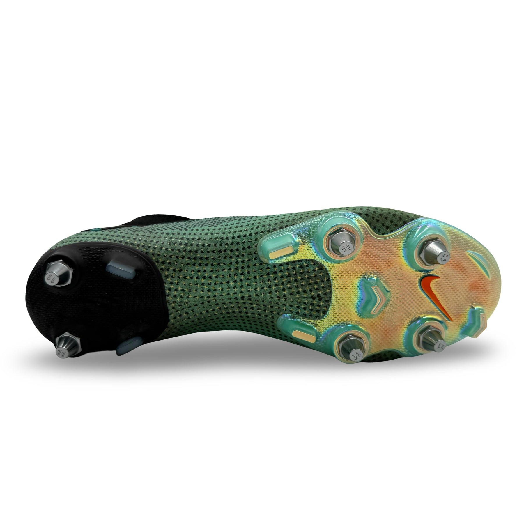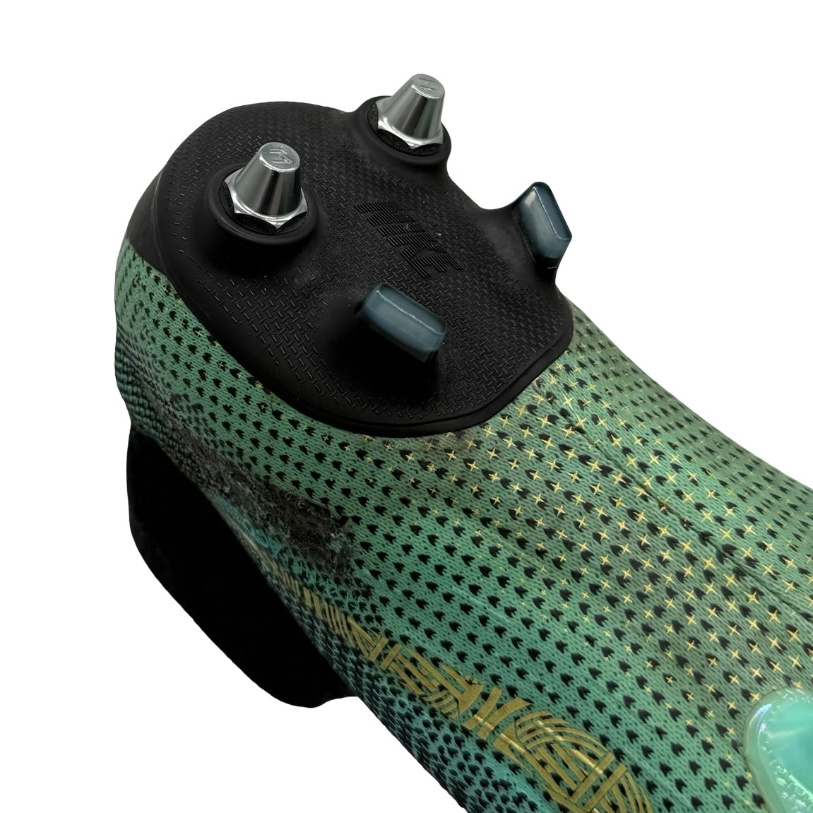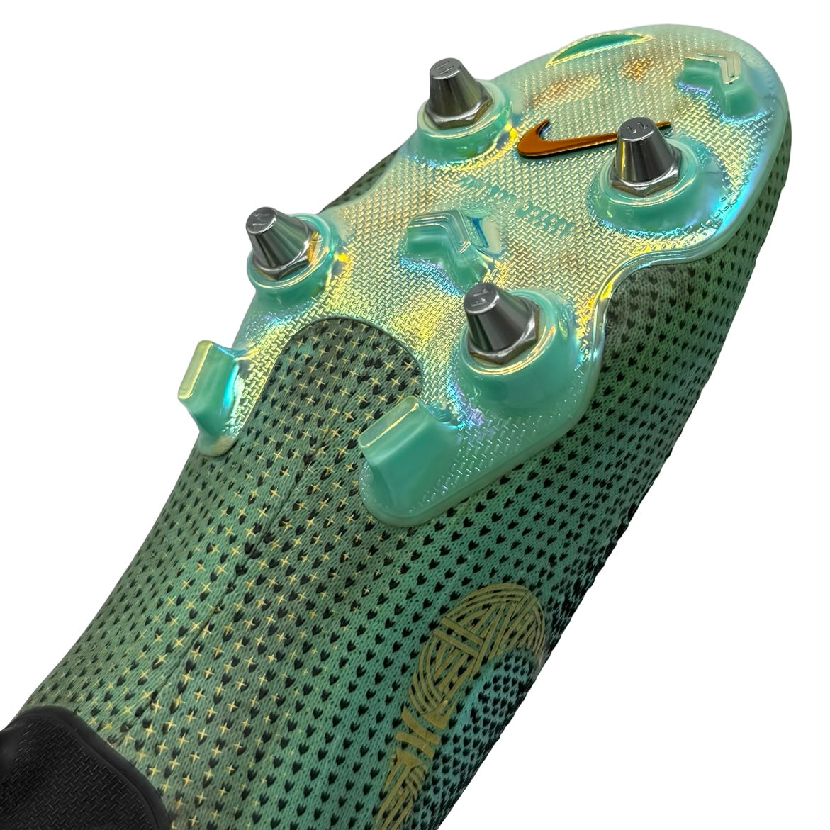 • Equipped with Ronaldo’s custom SG-Pro soleplate, featuring a unique stud configuration with shortened 11mm heel studs (standard production used 13mm), engineered to his precise traction preferences.