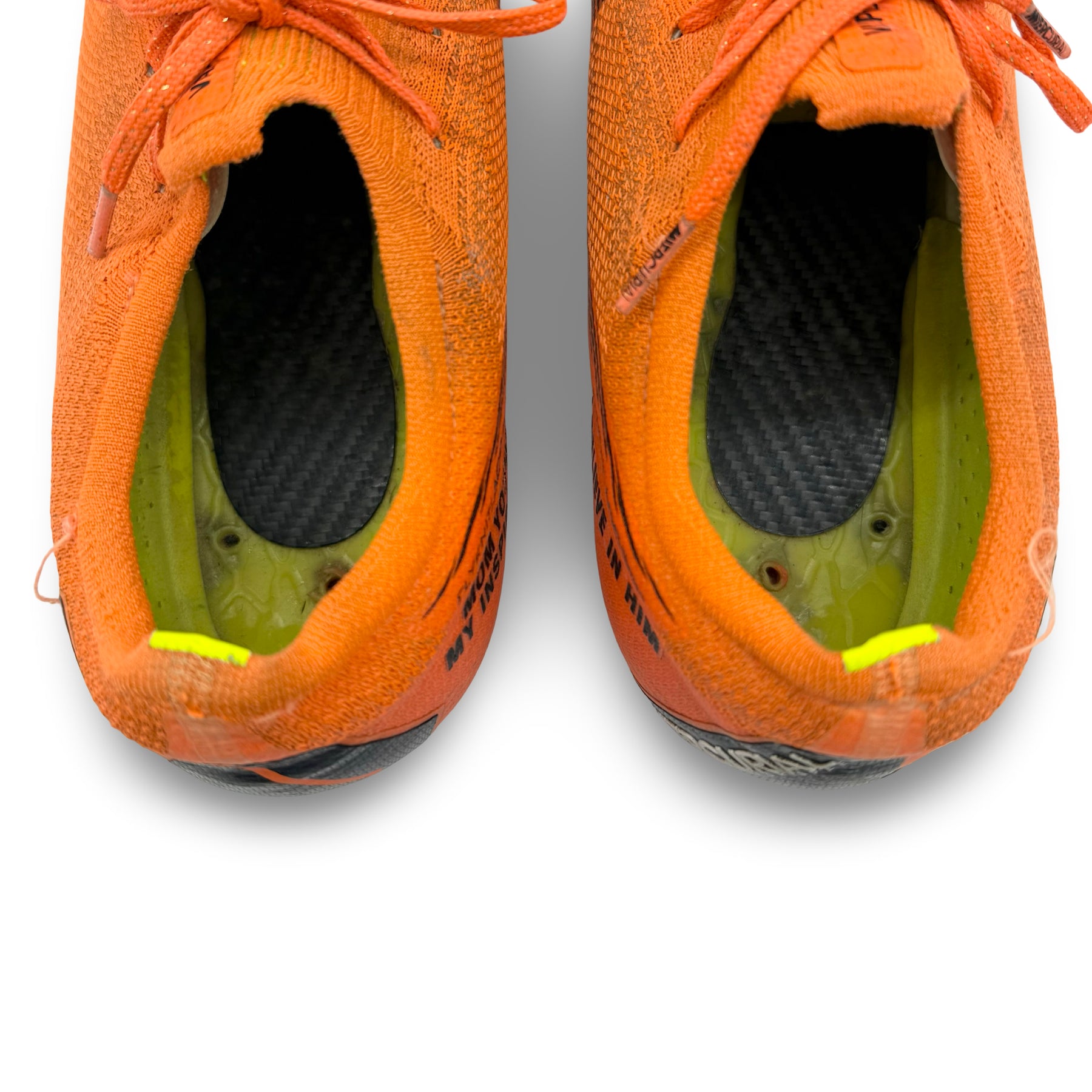 • Built with custom carbon fibre plates integrated within each sole for reinforced structure, strength, and responsiveness – a modification not found on retail versions.